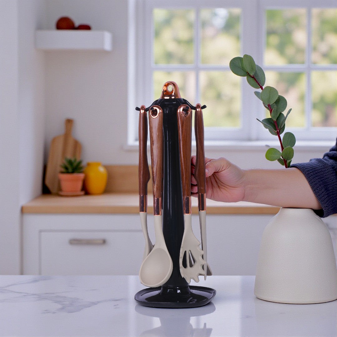 - Color: Black stand + wood-grain handles + rose-gold rings