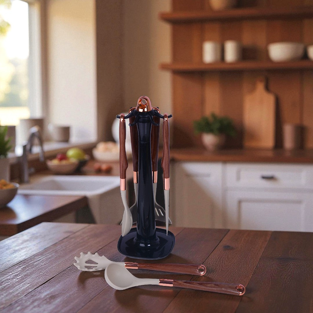 - Handles: Wood-finish plastic with metallic rose-gold accents