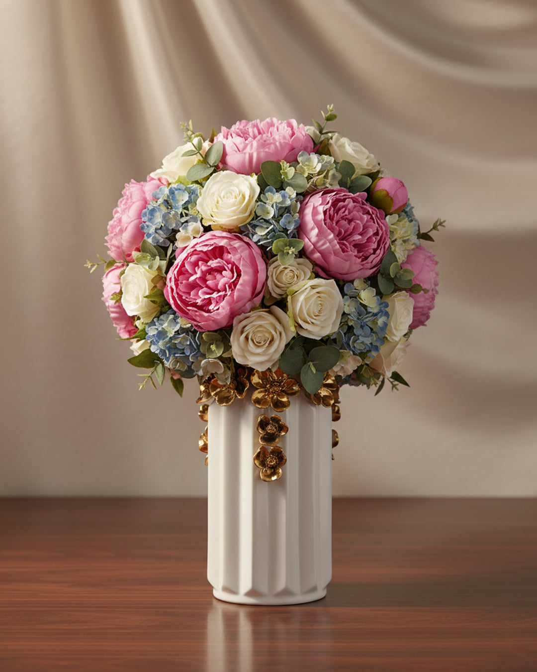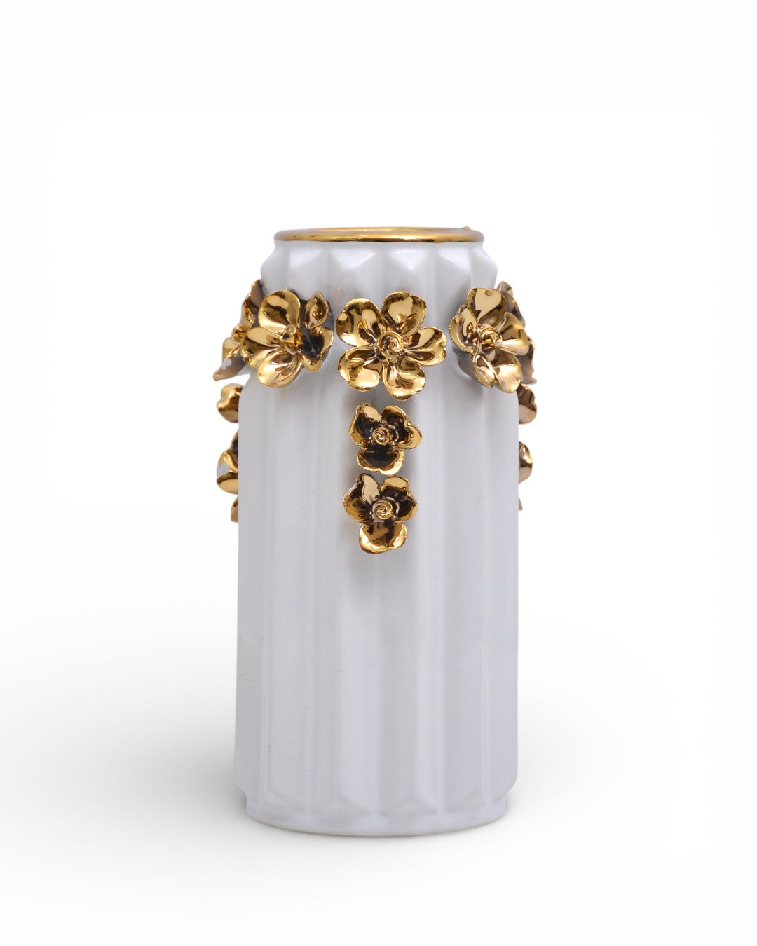 A premium white ceramic vase with golden flower detailing for an elegant and royal touch.