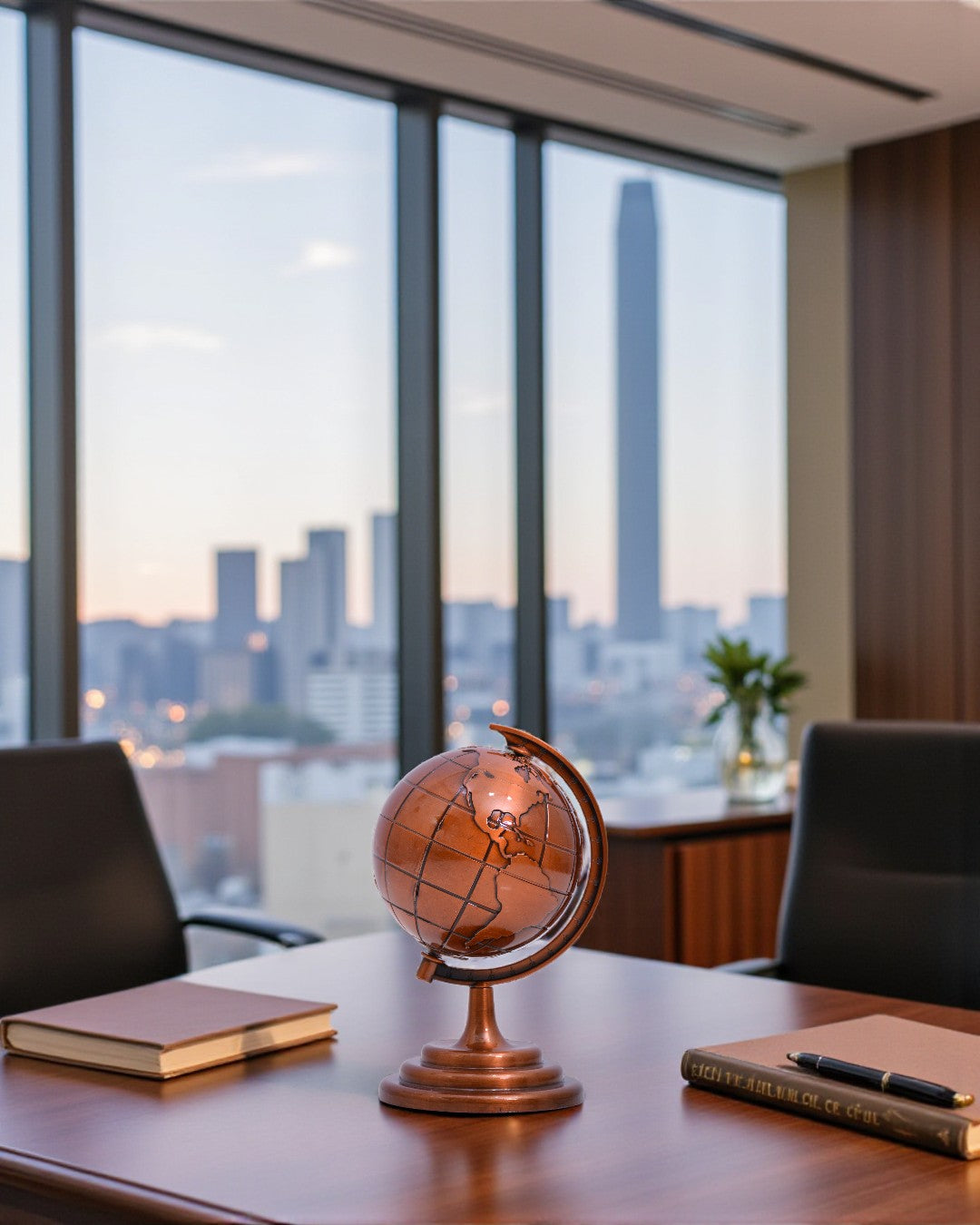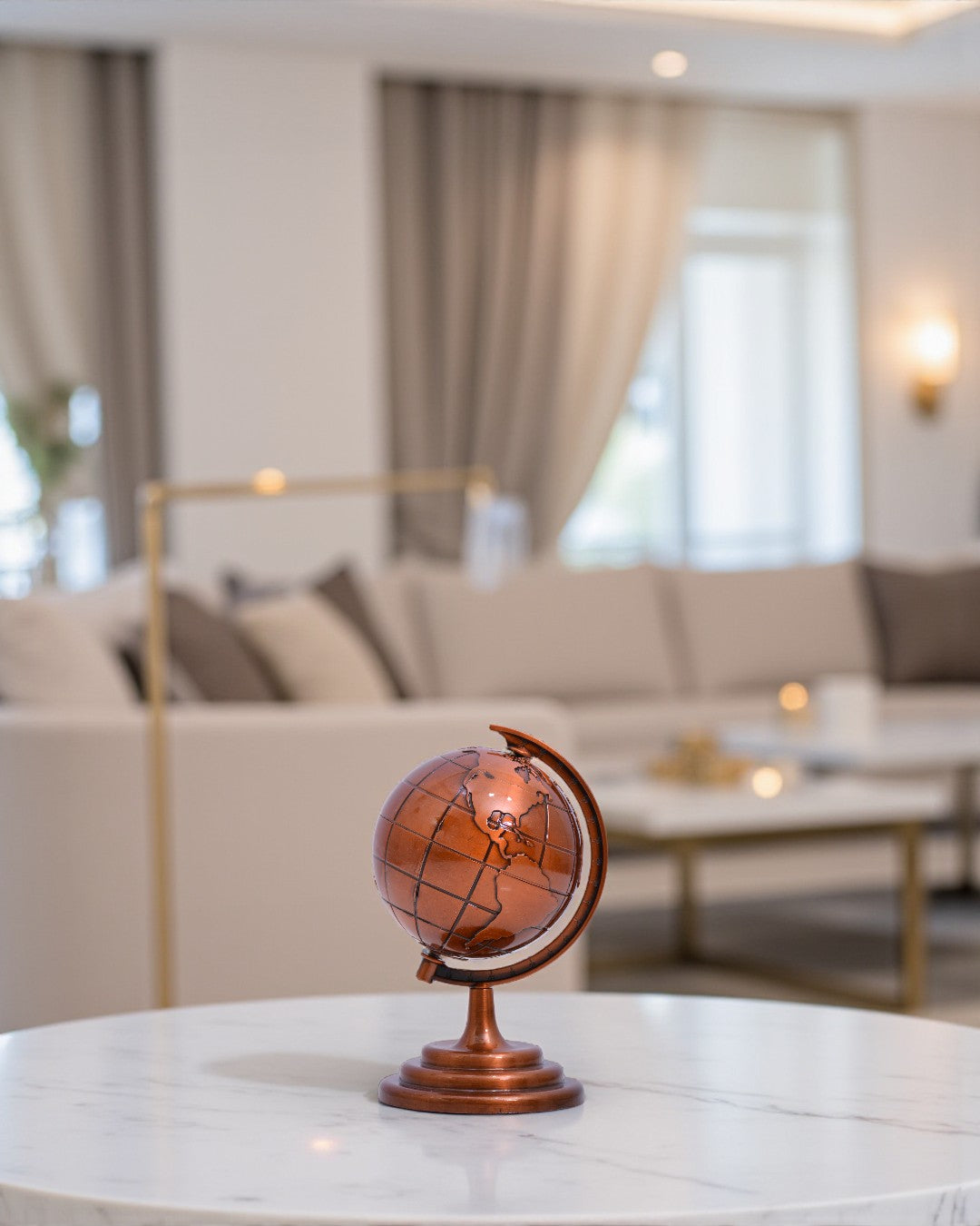 A vintage-style brown globe with engraved continents mounted on a classic pedestal stand.