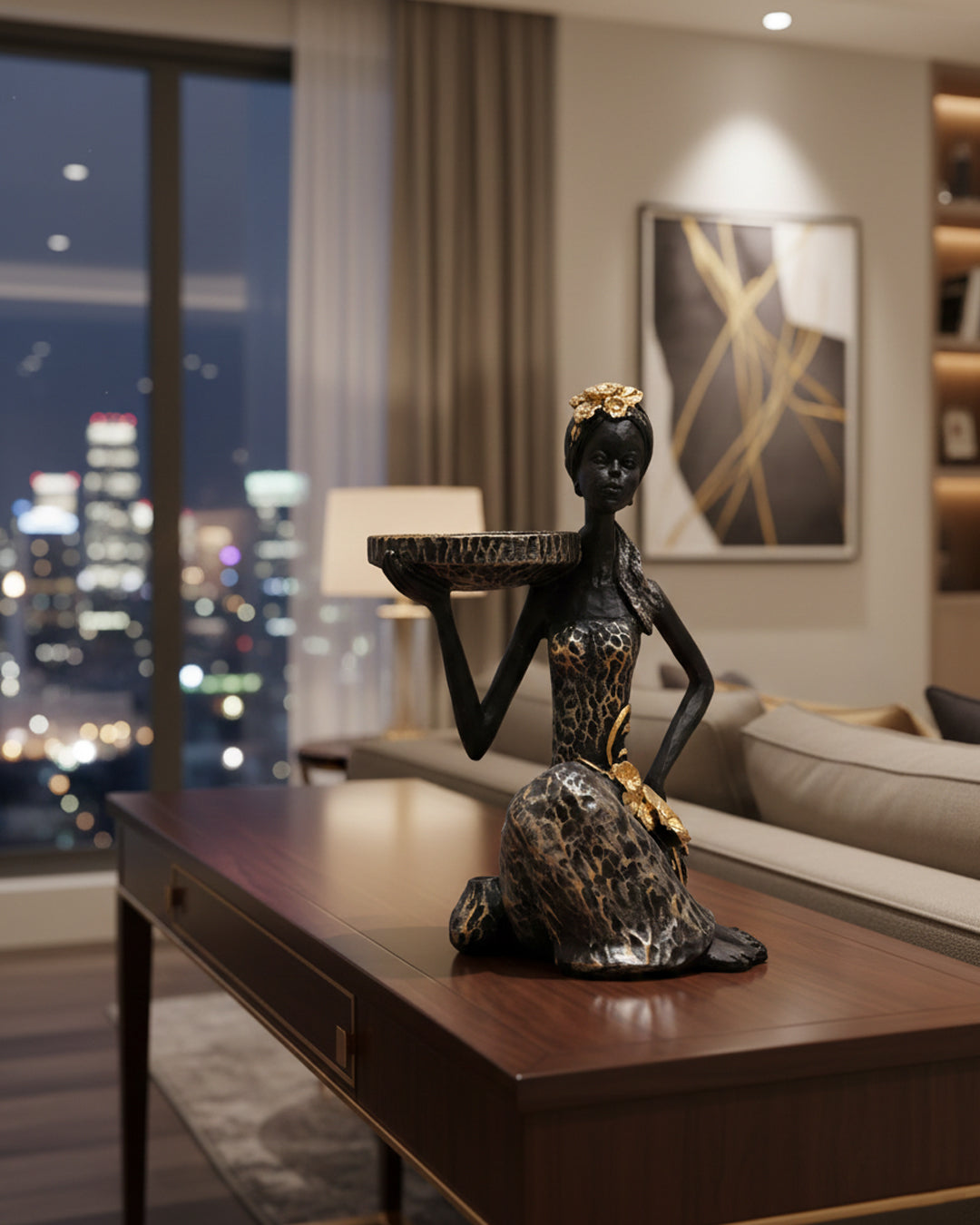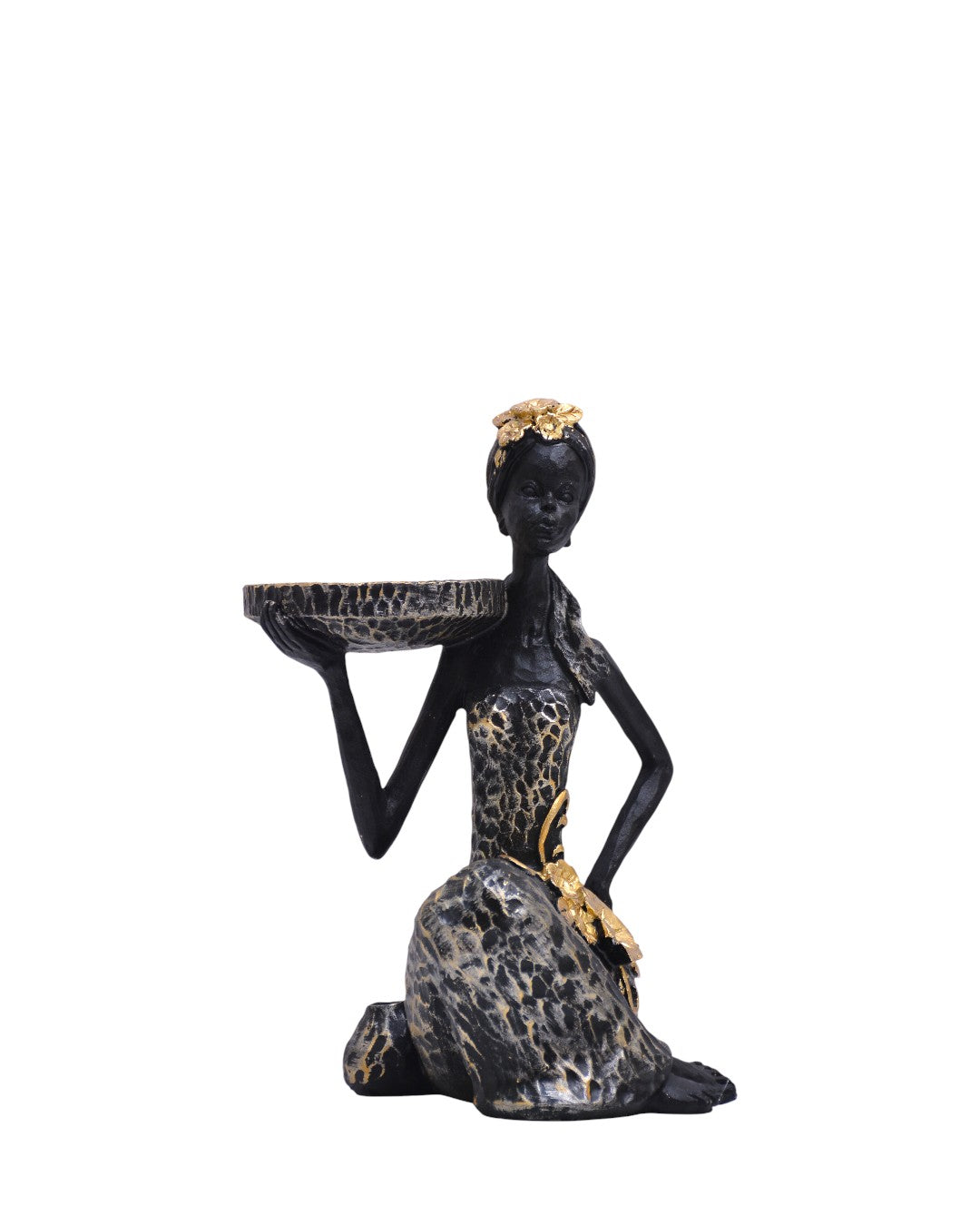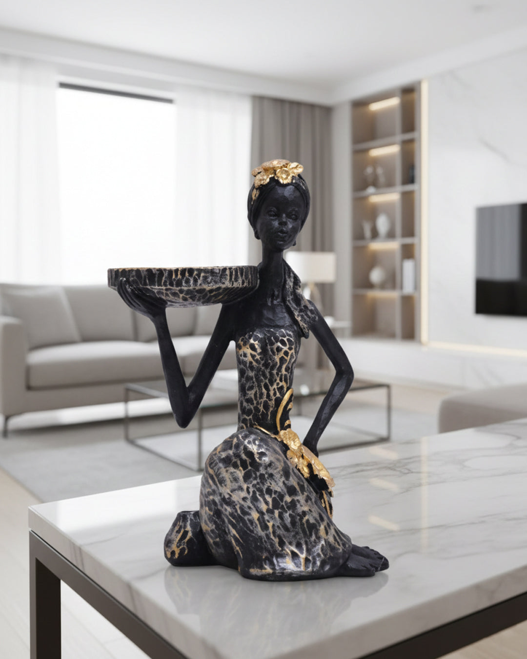 Add a touch of luxury and artistic charm to your home with this stunning decorative sculpture featuring a graceful lady holding a stylish tray. Designed with rich textures and gold accents, this piece beautifully blends functionality with modern décor.