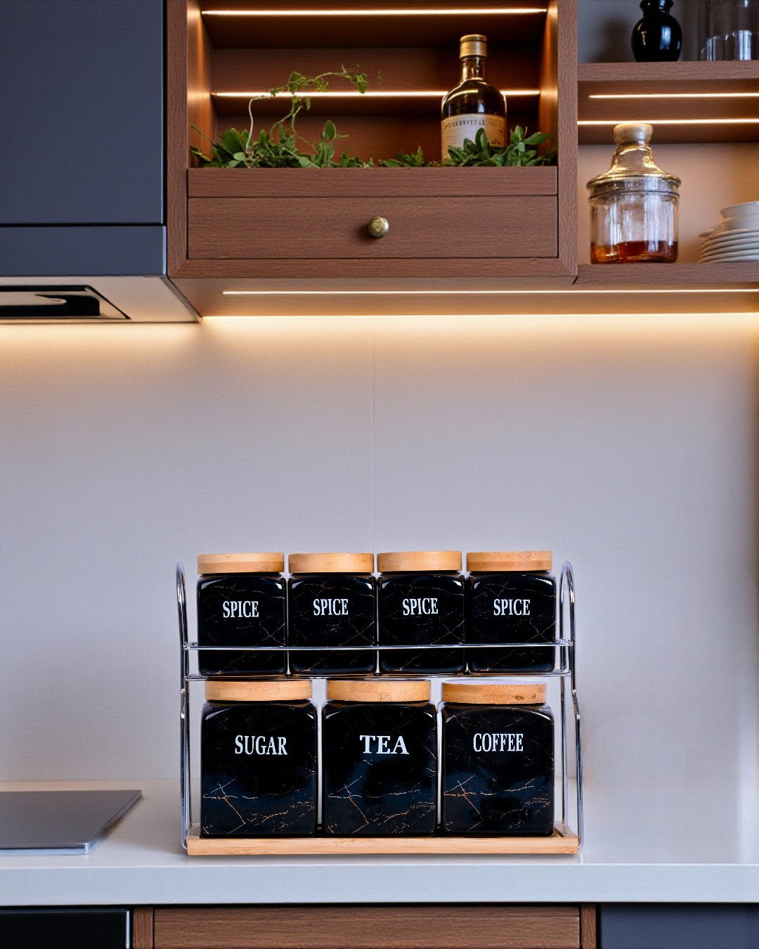 - 7-Piece Black Marble Kitchen Storage Jar Set with Wooden Lids & Metal Rack