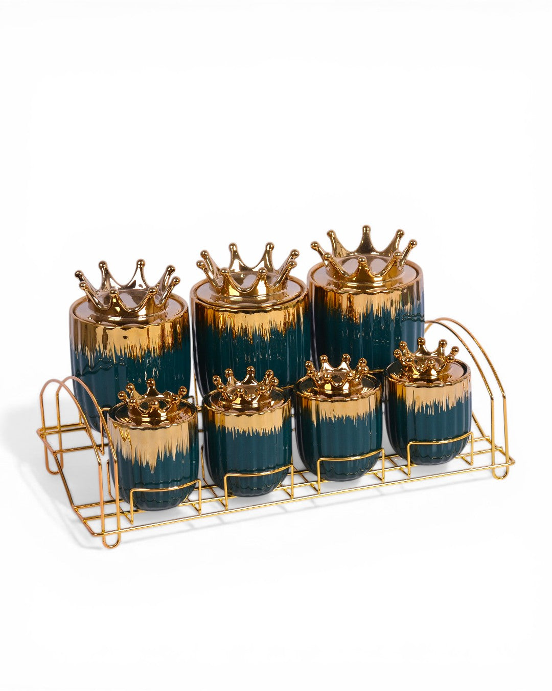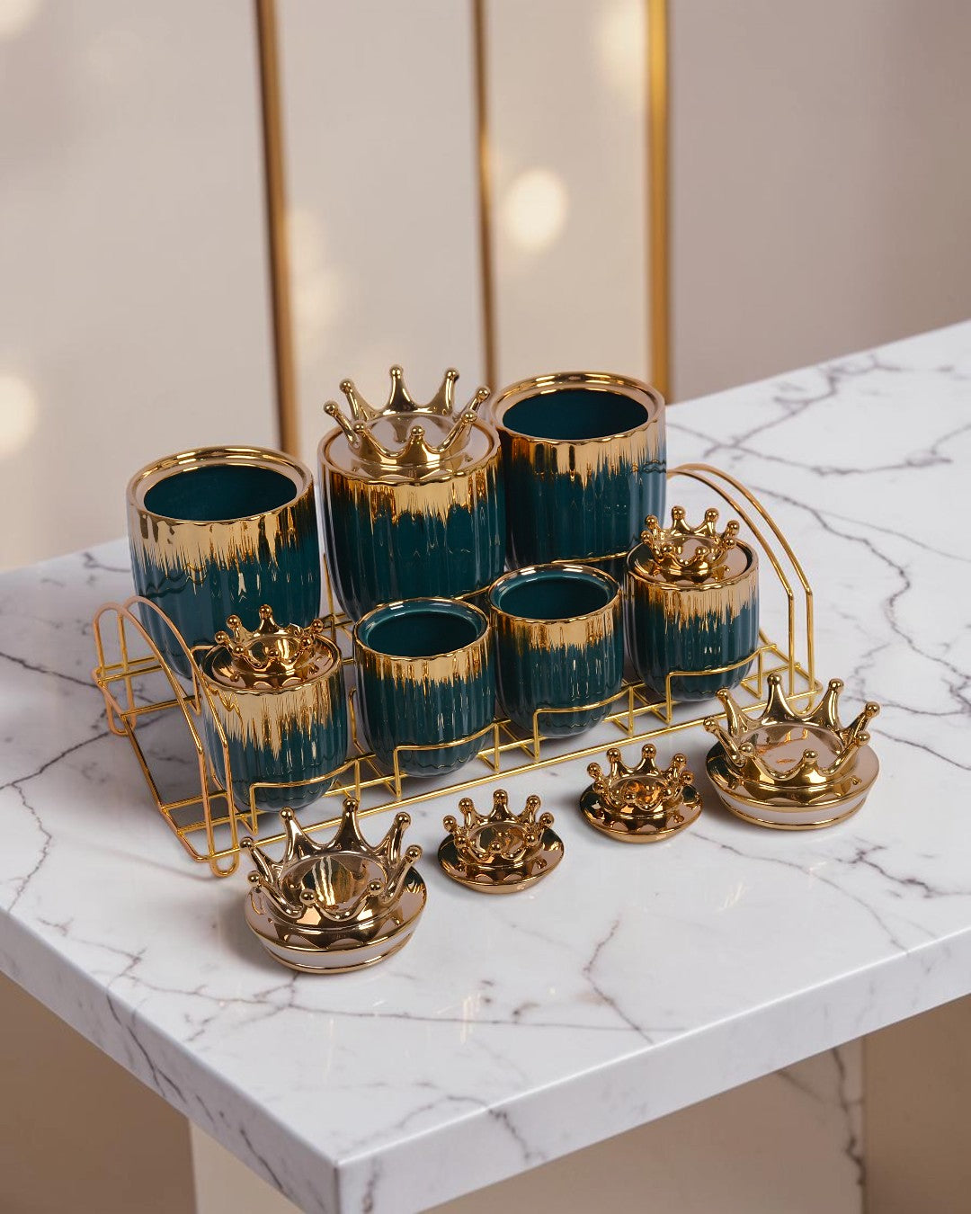 - Artisanal Gold Accents: The jars boast a luxury "gold-melt" or drip-glaze finish that contrasts beautifully against the rich emerald ceramic.