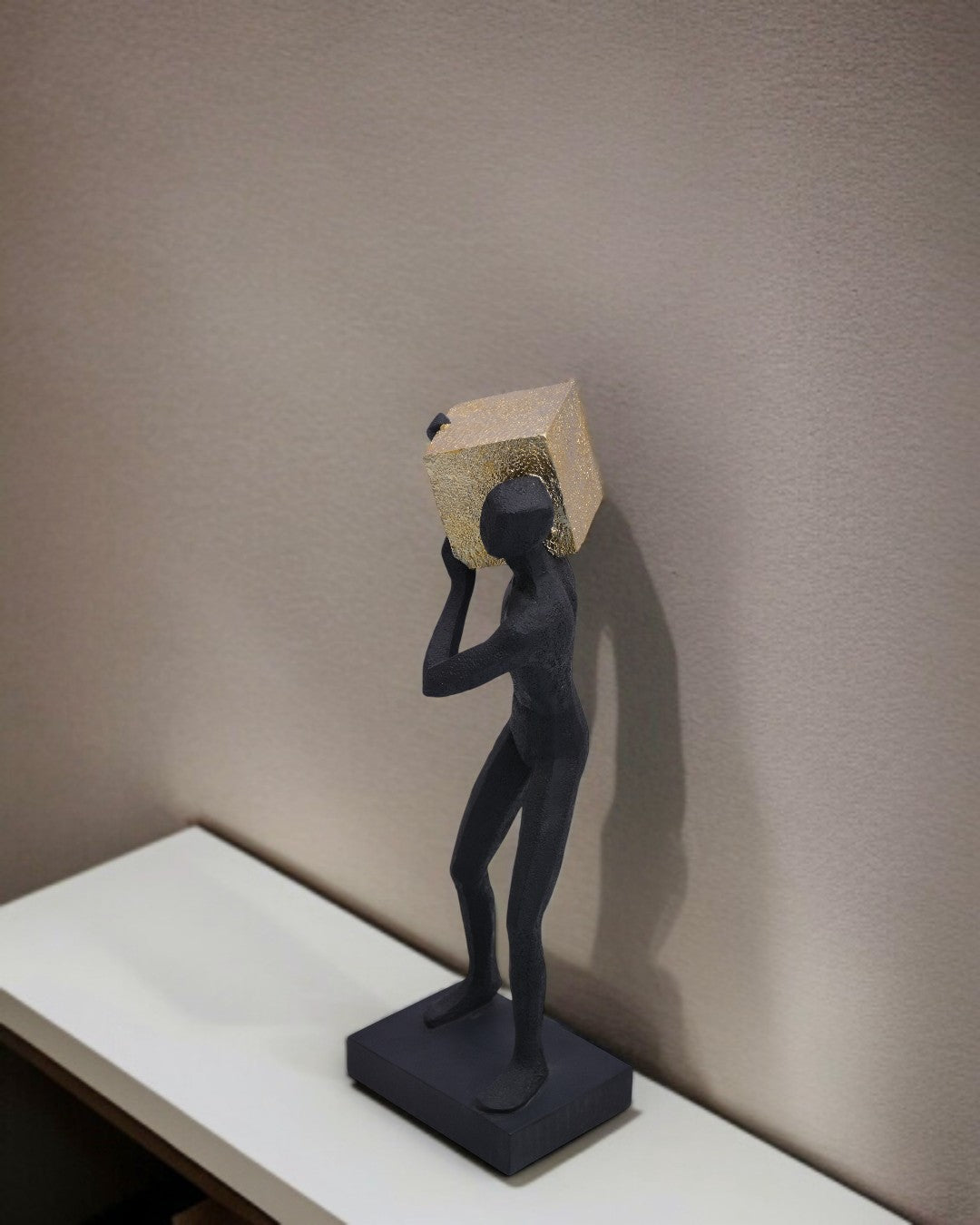 Elegant Abstract Man Holding Golden Cube Sculpture with modern black matte finish, perfect for luxury home and office décor.