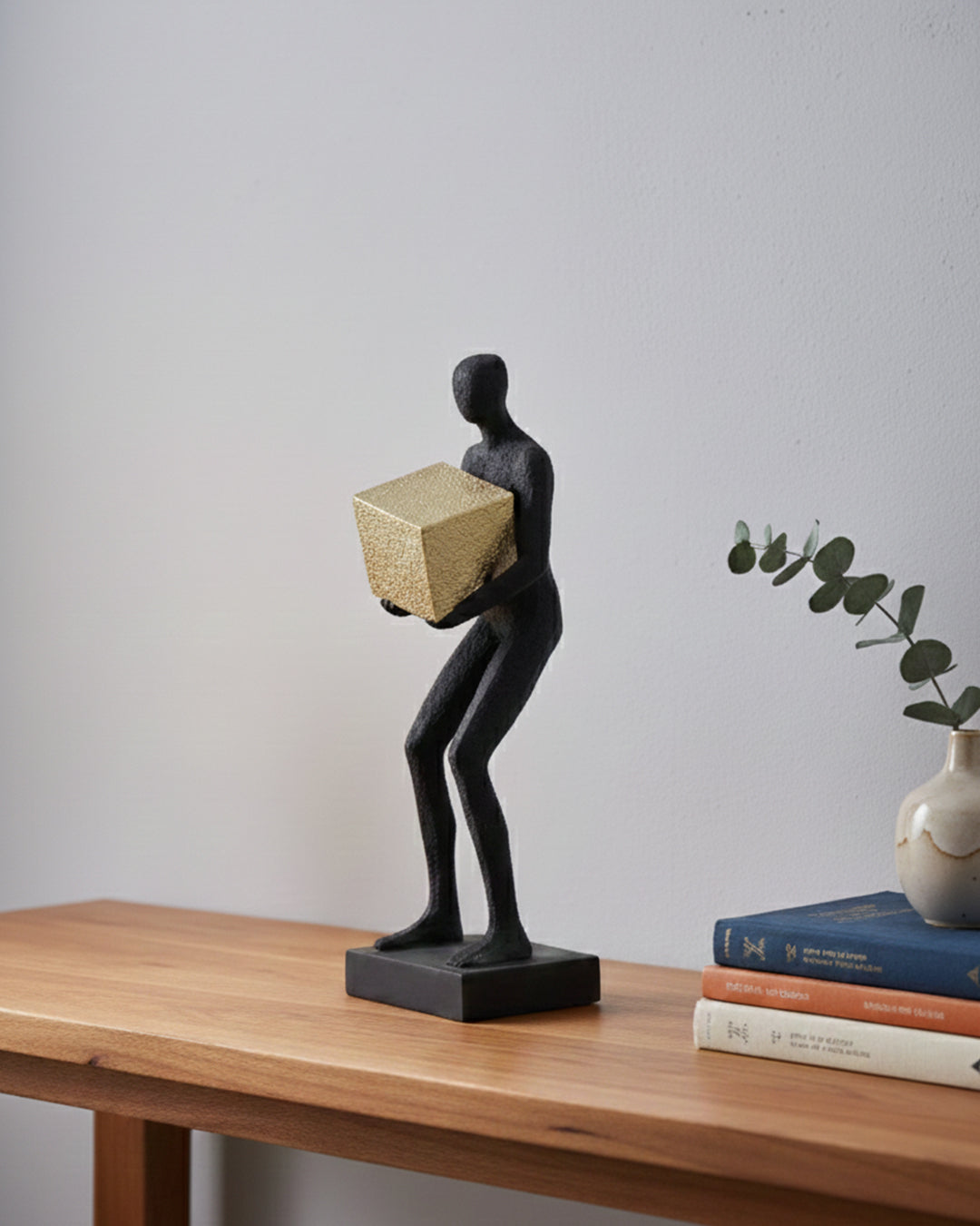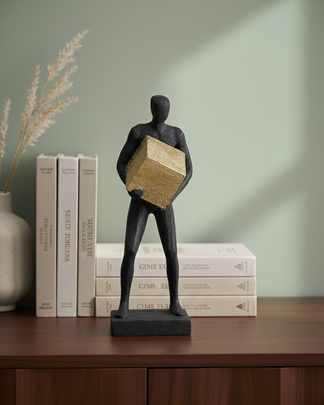 Modern Abstract Man Holding Cube Sculpture with premium black matte finish and golden cube design, perfect for luxury home and office décor.
