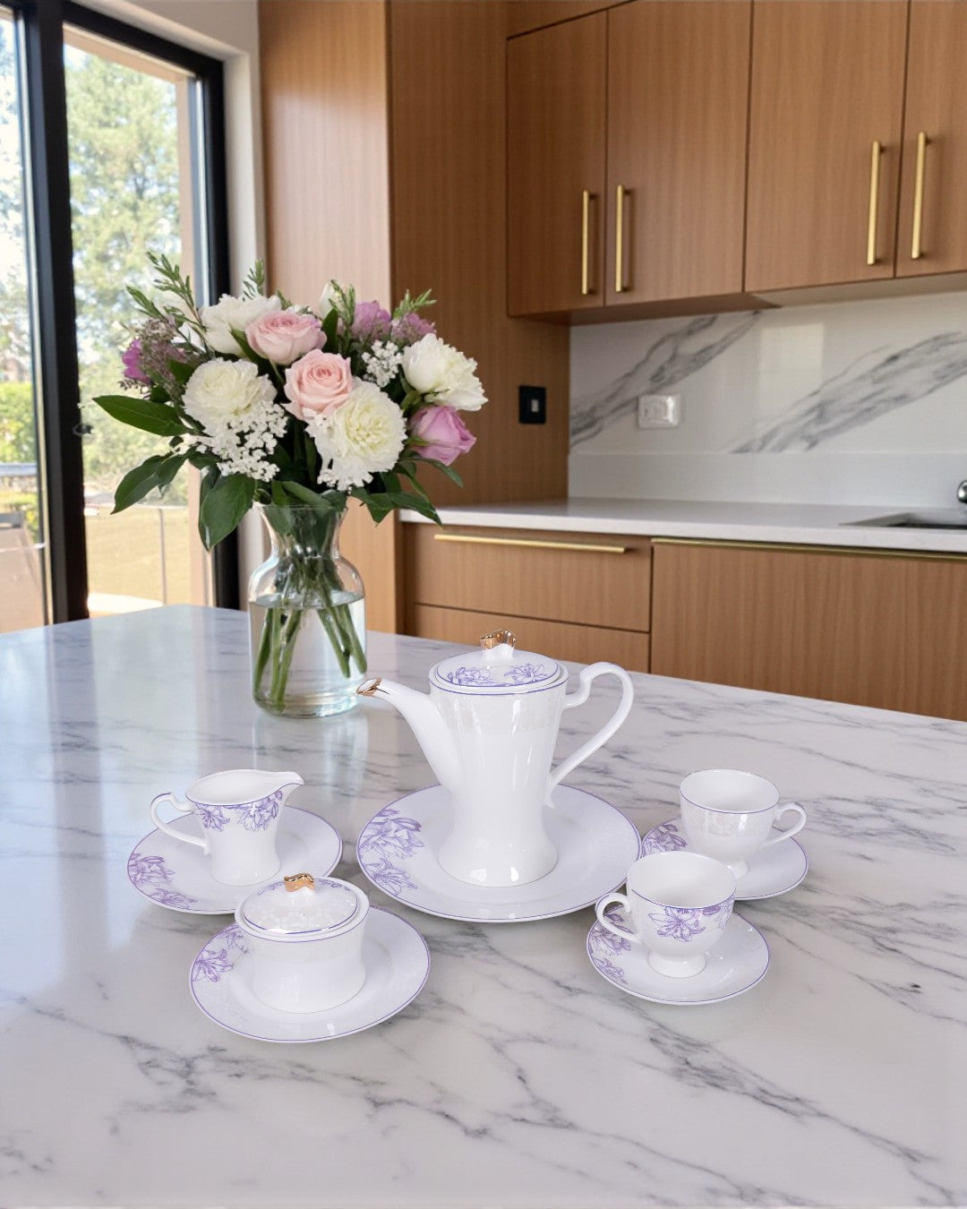 A beautifully crafted tea set with soft lavender floral patterns and golden accents for a refined table setting.