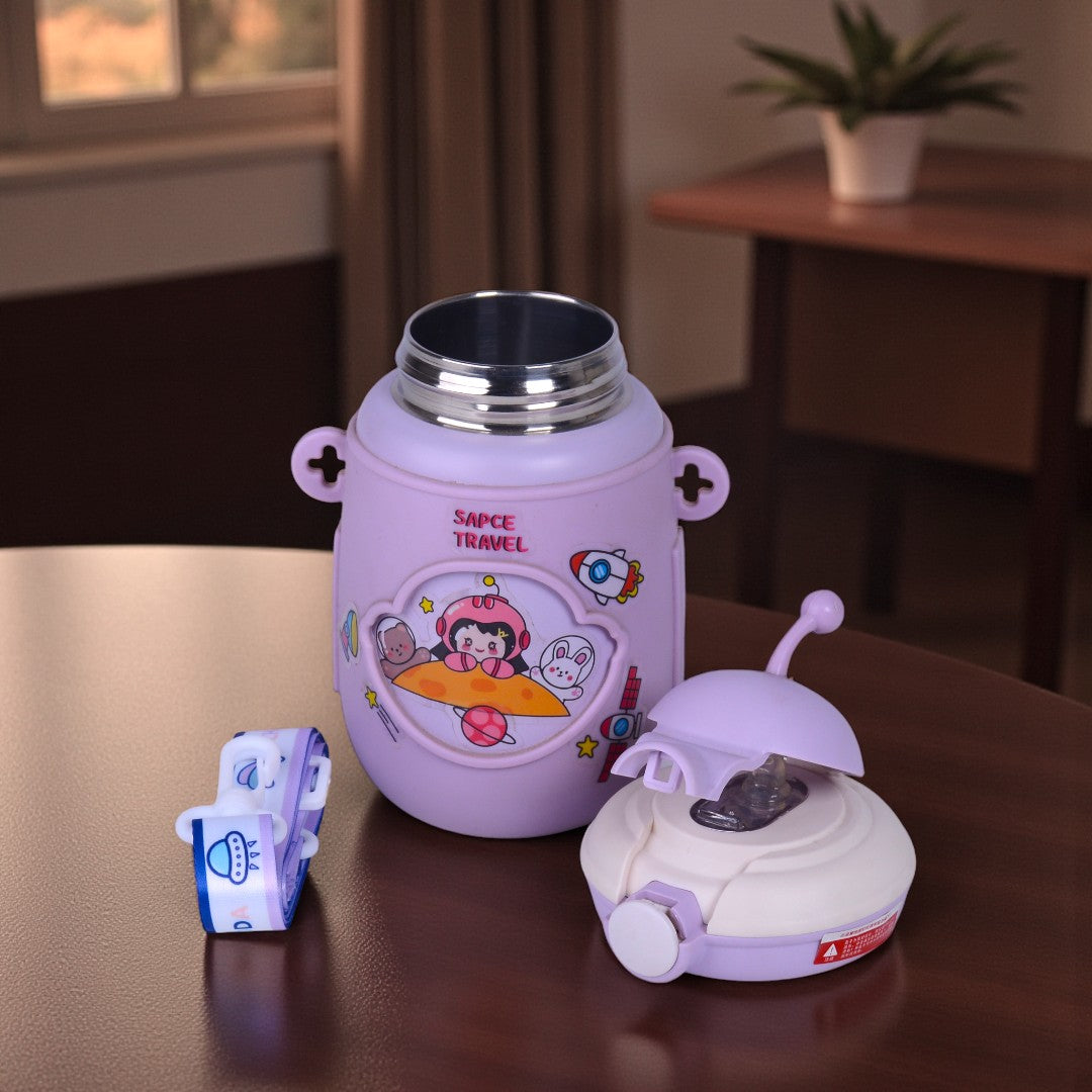 A cute space-themed insulated kids bottle designed to keep drinks warm or cold while making hydration fun.
