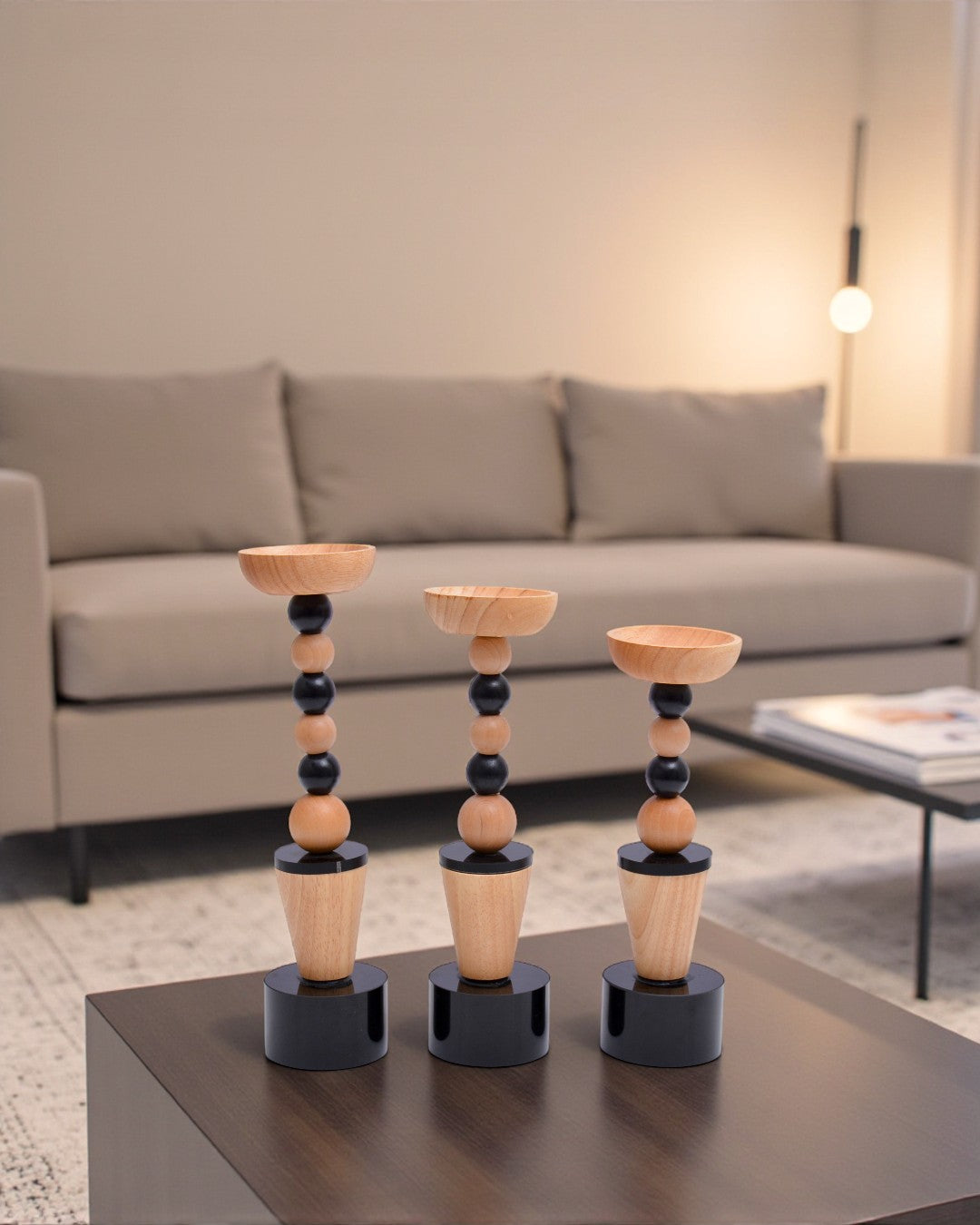 Stylish wooden candle holders with a modern black accent design for a warm, contemporary touch.